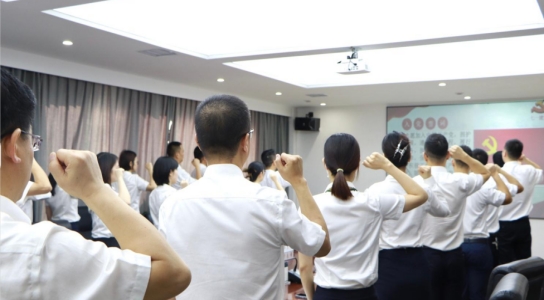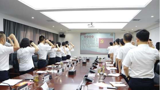 党委副书记、监事会主席蒋文胜带领全体党员重温入党誓词。大家身着正装,佩戴党员党徽,右手高举,精神抖擞,齐声庄严宣誓,用铿锵有力的声音传达出身为共产党员的自豪感和使命感。