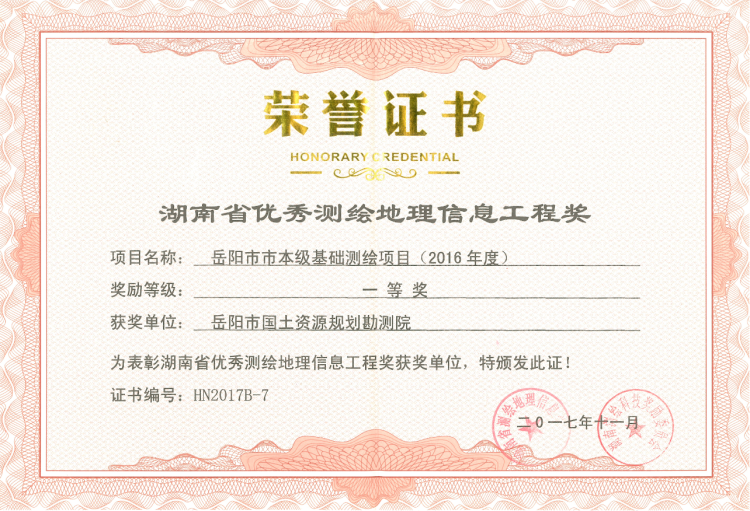 岳阳市市本级基础测绘项目(2016年度)一等奖