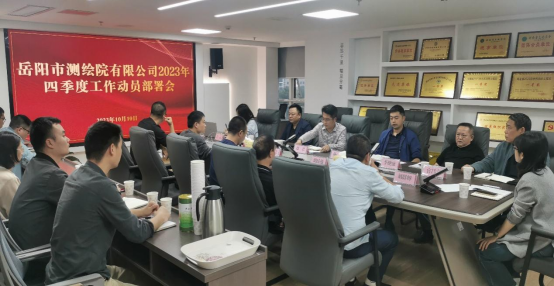 2023年10月10日,岳阳市测绘院有限公司组织中层及以上领导干部召开2023年四季度工作动员部署会,会议由郑君董事长主持,在总结前3个季度工作成效、存在的问题的基础上,锚定2023年度目标任务,安排部署重点工作,全力冲刺四季度,打好转企首年度收官战。
