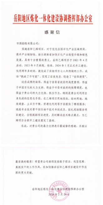 春风送暖,踏歌而行―― 一封来自岳阳地区炼化一体化建设协调指挥部的感谢信